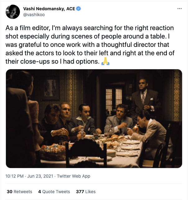 This inspiration for this issue of Cut/daily is this tweet from editor Vashi Nedomanksy, discussing how useful a few close up looks around the table are when it comes to multi-character dinner table scenes.