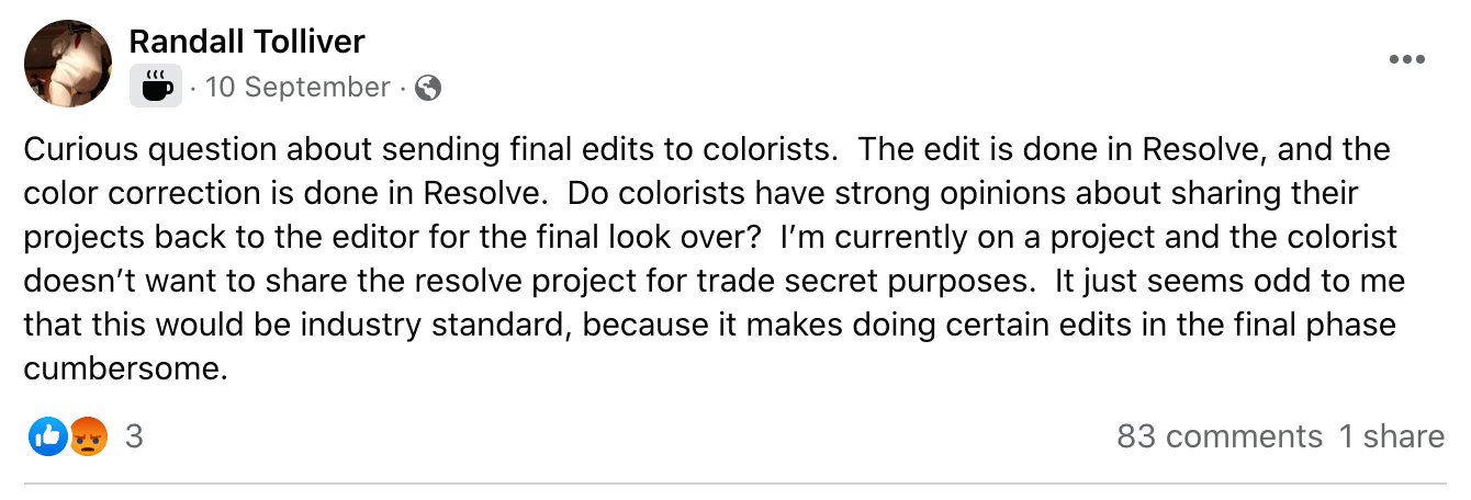 This was the question Randall Tolliver asked in the Blue Collar Post Collective Facebook Group, one day in September.
