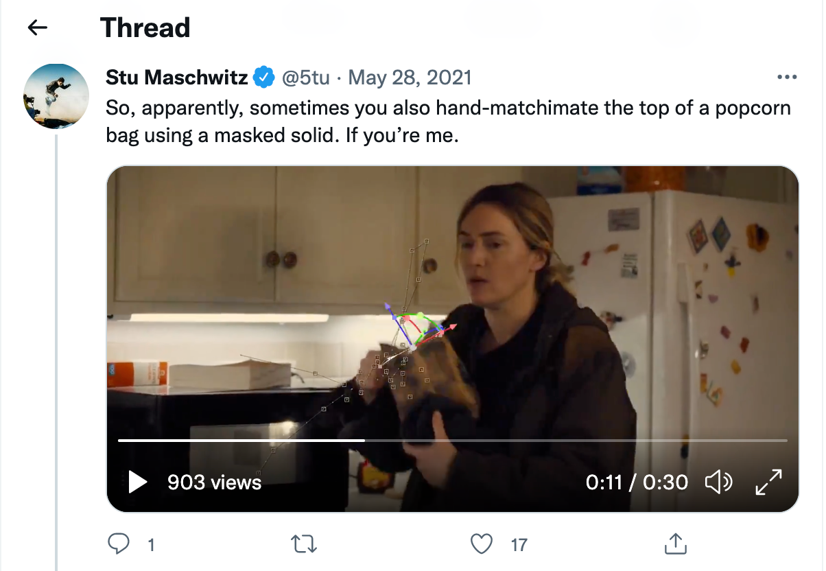 VFX Artist Stu Maschwitz tweeted this detailed thread breaking down the work that went into his decision to add some 3D steam to a hot bag of popcorn in this shot from the Primetime Emmy award winning, Mare of Easttown.