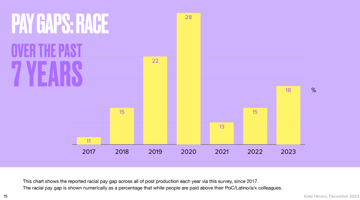 More broadly, though, men were paid 18.5% more than women working in post-production, which is 2.5% higher than the US national average of 16%.