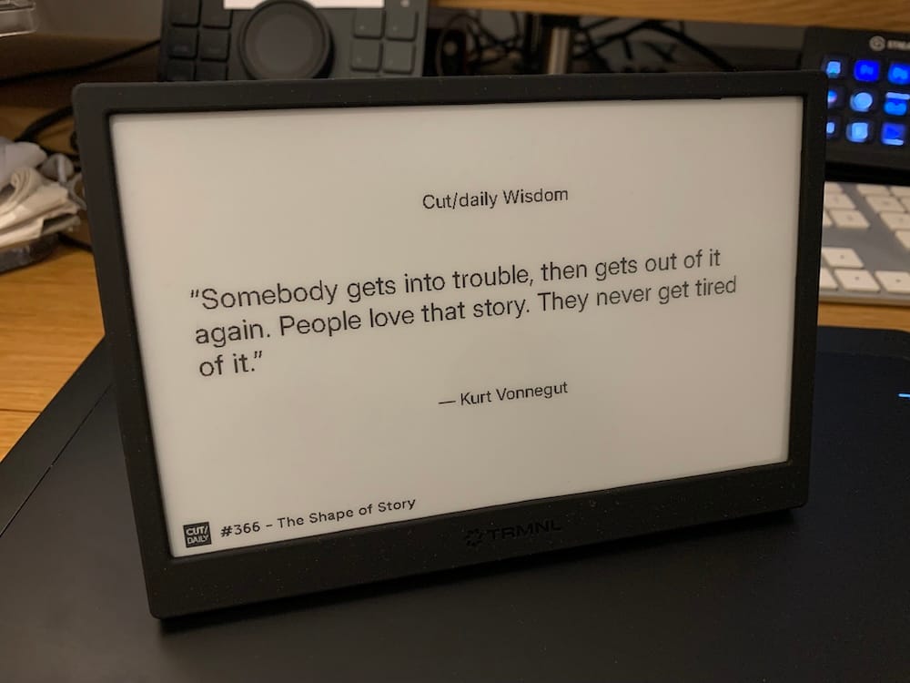 If you get yourself a TRMNL, you too can enjoy the Cut/daily wisdom plugin, featuring a choice nugget of editorial wisdom, gleaned from the annals of Cut/daily's 500 Issue Archive, in particular the 80+ Cut/daily Meets... interviews with some of the industry's best and brightest.